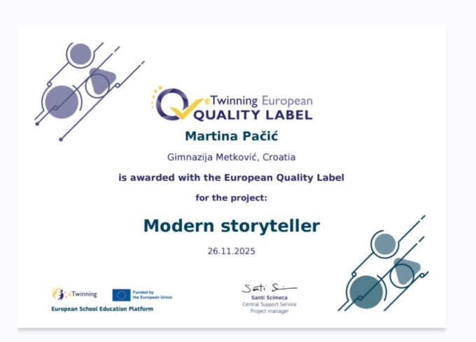 Gimnazija Metković dobila je Europsku oznaku kvalitete za eTwinning projekt „Moder storyteller“ u kojem su voditeljice bile Antonija Glamuzina, Martina Pačić i Suzana Nižić. Projekt je povezivao učenike iz različitih zemalja (Hrvatska, Slovačka, Turska, Poljska) putem pripovijedanja — spoj narodnih priča i urbanih legendi prilagođenih digitalnoj eri. Zajedničke aktivnosti omogućile su učenicima predstaviti se kao omiljeni književni likovi, stvarati međunarodne priče, snimati videozapise i sastavljati zajednički „e‑book“. Ciljevi su bili poticanje čitanja, razvoj medijske pismenosti, jačanje školskog knjižničarstva i europske dimenzije učenja. Evaluacija je uključivala povratne informacije učenika i nastavnika, dokumentiranje izazova te brojne druge zajedničke aktivnosti – sve u duhu međukulturnog razumijevanja, kreativnosti i prijateljstva među mladima.